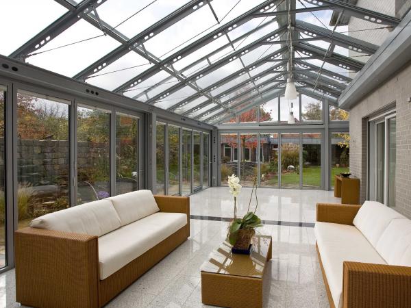 Основные строительные материалы, используемые в строительстве зимних садов – это стекло и алюминиевый профиль, из которого осуществляется монтаж несущего каркаса, при возведении которого необходимо учитывать, что конструкция должна иметь значительный запас прочности, способный выдерживать в холодное время года нагрузки от слоя снега и сильного ветра. Всю эту нагрузку принимает на себя каркас, так как, запас прочности стекла не рассчитан на такое сильное воздействие. Все элементы зимнего сада изготавливаются из специализированного алюминиевого профиля. Так как алюминий имеет высокую прочность при незначительном удельном весе, его можно использовать для изготовления жестких профилей большого размера, а учитывая его легкость в обработке, каркасной конструкции можно придать практически любую форму.